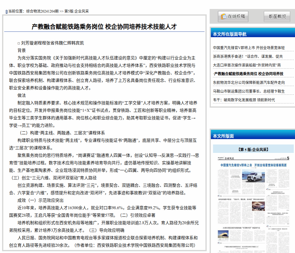 产教融合赋能铁路乘务岗位 校企协同培养技术技能人才