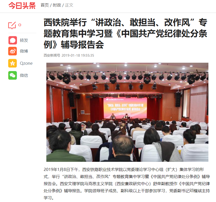 今日头条:西铁院举行“讲政治、敢担当、改作风”专题教育集中学习暨《中国共产党纪律处分条例》辅导报告会
