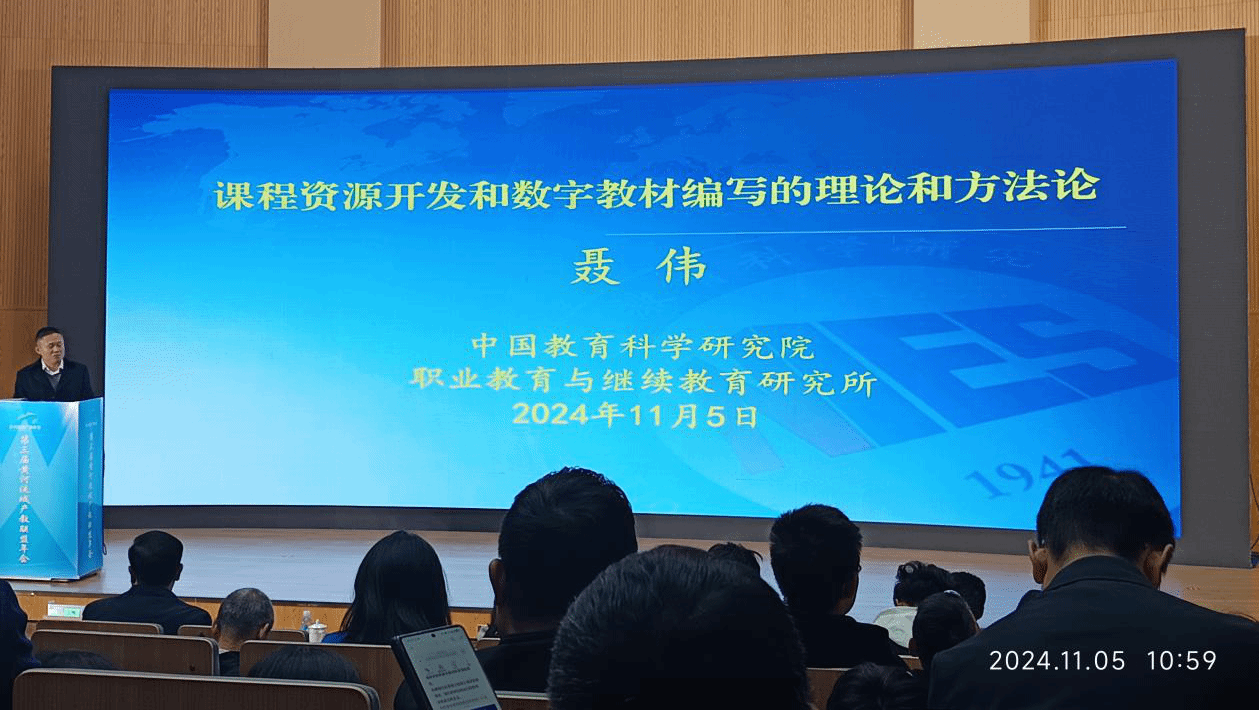 第二阶段是主题报告及交流座谈阶段。邀请南京信息工程大学副校长邓志良做报告,他围绕产教融合的要义、发展及十项创新实践案例和五条深化路径展开,概括性的分析工程技术中心、协同创新中心、职教联盟等案例的优缺点,创举性的总结校企合作利益机制、共建多功能产教融合平台的路径探索。会议还邀请了中国教育科学研究院聂伟教授做了题为《课程资源开发和数字教材编写的理论和方法论》的报告,他以其扎实的学识和详实的研究数据从数字化教材、电子教材、多媒体教材、网路教材、新形态教材和智慧教材六个方面进行全面的解读和分析,启发性的为各位参会人员广开思路,传经送宝。