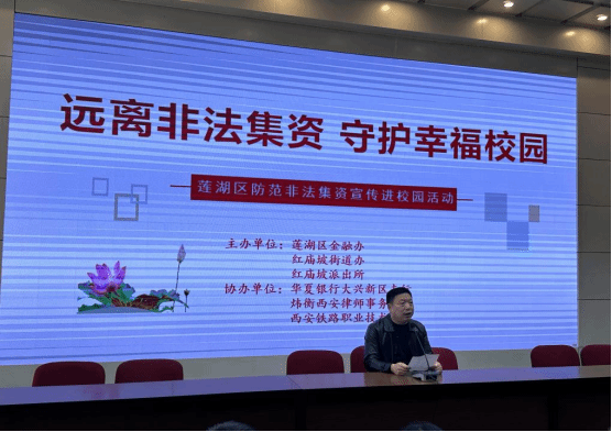 为深入贯彻落实《防范和处置非法集资条例》,切实做好防范非法集资宣传教育工作,提升校园师生金融风险防范意识,11月22日,在西铁院自强校区举办了莲湖区“远离非法集资 守护幸福校园”防范非法集资宣传活动。出席活动的领导和嘉宾有:莲湖区金融办主任马连山、红庙坡街道办党工委副书记姚亮亮、红庙坡派出所警长、西安炜衡律师事务所律师、华夏银行大兴新区支行工作人员及相关专业人士 。交通运输学院党总支书记王秀丽、自强综合管理处副处长李勇,交运、电子学院学工办主任、各部门负责人及全体师生约300人共同参加了此项活动。