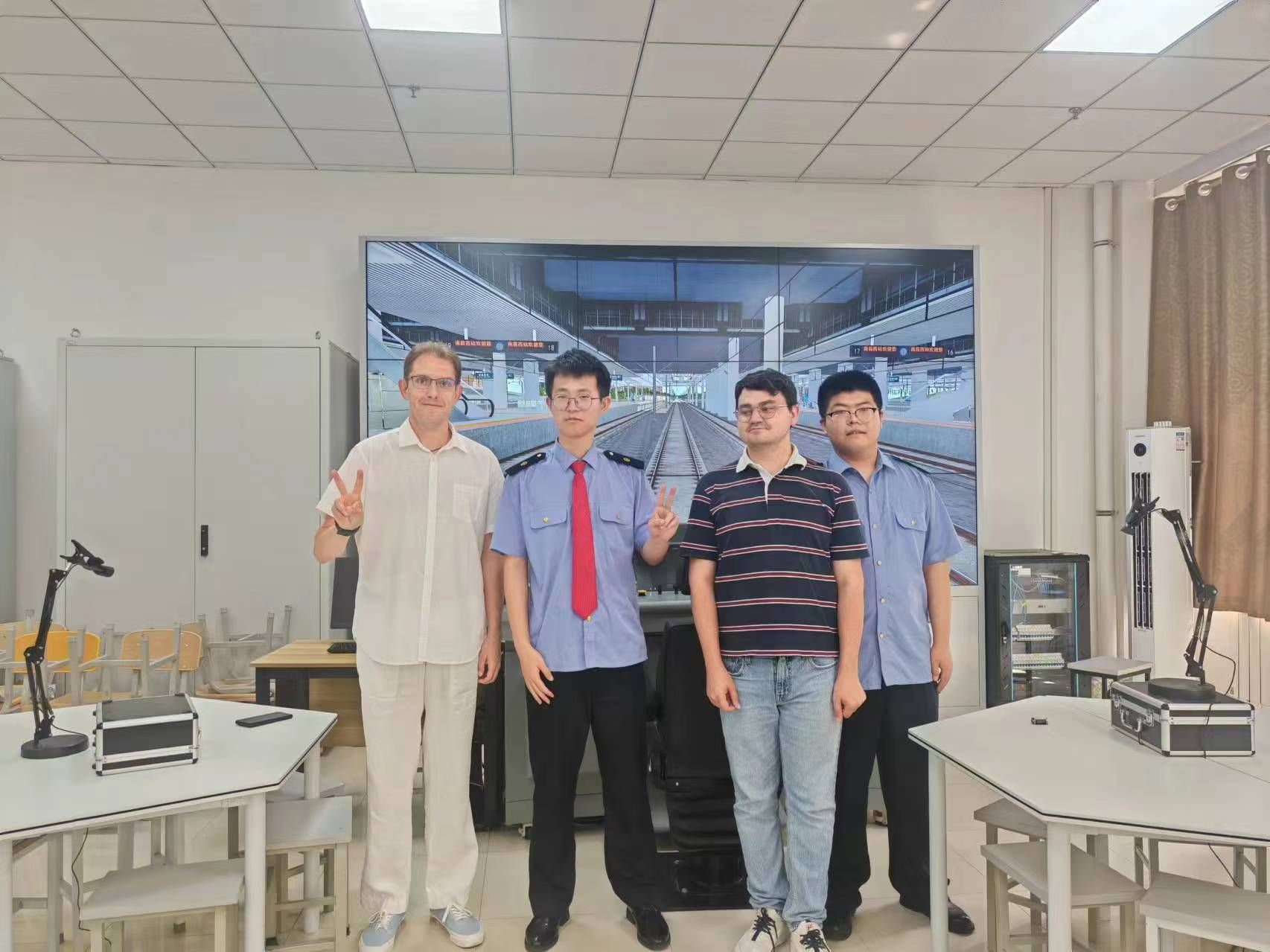 学院副院长滕勇会见了专家团队并进行了座谈。专家们分别与学院铁道供电教研室、铁道车辆教研室、铁道运营教研室、工程测量教研室、铁道机车运用与维护教研室团队进行了座谈研讨,期间参观了城轨接触网实训室、复兴号模拟驾驶实训室、高速铁路调度指挥实训中心等,并观摩了“学生技能竞赛月”学生参赛情况。伊万·巴拉诺夫教授感叹在俄罗斯没有这么好的实践条件,赞叹学生的实操能力和教师的教学水平,表示此次交流收获很大。安德烈·尼基钦教授带领学生们在校园里进行了为期三天的分组测量实践。