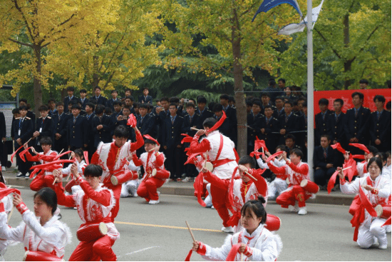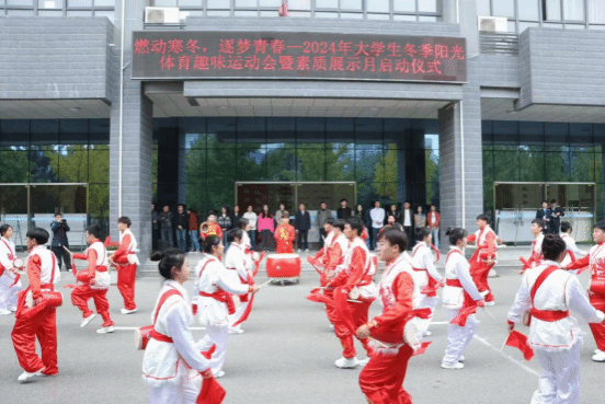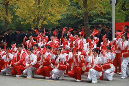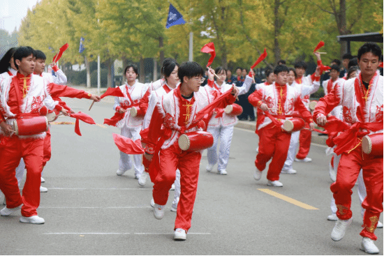 仪式上,学院腰鼓社团为师生们带来精彩的腰鼓展演,他们铿锵有力的鼓点、飘舞飞扬的红绸、青春活跃的身影,形成一道壮丽的风景线,欢乐的氛围洋溢在初冬的校园里。
