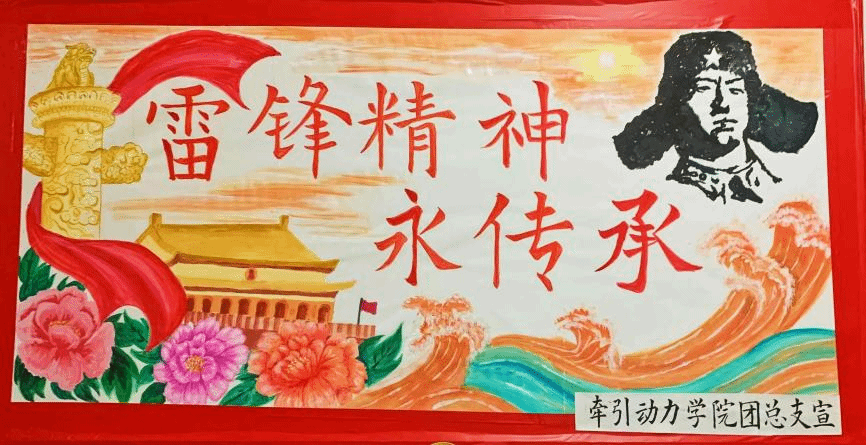 用画笔传承“雷锋精神”。3月上旬,在全国第60个学雷锋纪念日来临之际,牵引动力学院宣传部与各团支部精心设计,充分发挥板报宣传阵地作用,以多角度的形式展现出雷锋同志“为人民服务”的核心宗旨和雷锋面对困难时的“钉钉子精神”,把对雷锋的尊敬与敬仰之情,都融入到了一块块美观大方、主题突出、图文并茂、创意新颖的板报里。