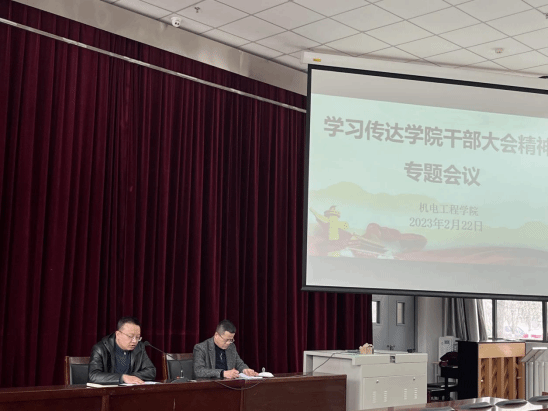为进一步贯彻落实学院干部大会精神,推动学院“重点突破”、“强基提质”项目建设,明确2023年工作思路和各项任务,2月22日,机电工程学院在阶梯教室召开学习传达学院干部大会精神专题会议,学院全体教职工参加会议。