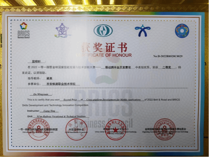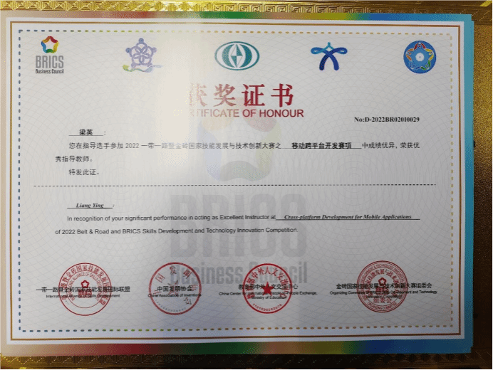 在2022年一带一路暨金砖国家技能发展与技术创新大赛移动跨平台开发赛项比赛中,纽约国际官网电子信息学院参赛选手屈明轩荣获二等奖,指导教师梁英荣获优秀指导教师,学校荣获优秀组织奖。