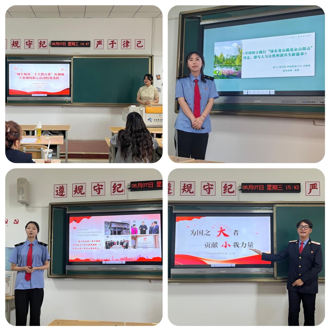 自接到《关于举办“师生畅谈党的二十大·微宣讲”展示交流活动的通知》开始,马克思主义学院迅速组织师生开展校赛活动。在校赛选拔中,参赛师生积极参与、勇于挑战,展现出了青春最美的模样。最终,根据活动要求,推选教师梁帆,教师张倩指导的学生吕新悦,教师何苗指导的学生王健,教师赵楠指导的学生苏媛参加网络评选。