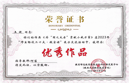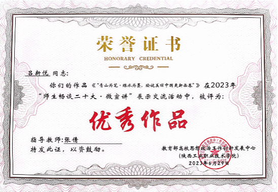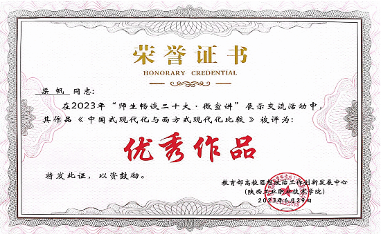 据悉,来自全省31所高职院校分教师组和师生组,总计123项作品参加了此次网络评选,共评选出40余项优秀作品。纽约国际官网马克思主义学院教师梁帆的作品《中国式现代化与西方式现代化比较》、张倩老师指导学生吕新悦的作品《青山为笔·绿水为墨,绘就美丽中国更新画卷》、何苗老师指导学生王健的作品《为“国之大者”贡献小我力量》等三项作品,被陕西省职业技术教育学会思想政治教育理论研究与教学指导委员会、教育部高校思想政治工作创新发展中心评为“优秀作品”。