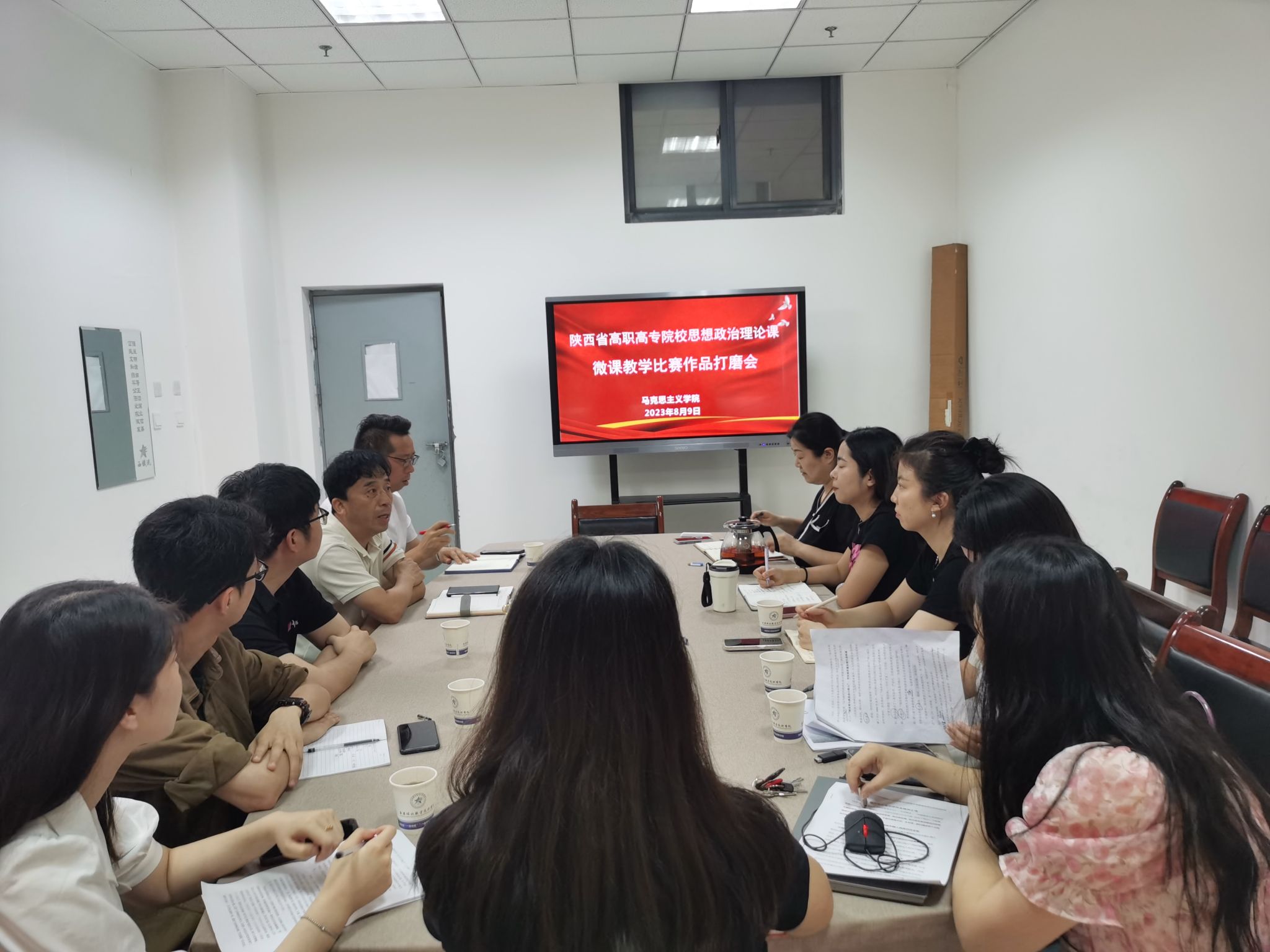 8月9日上午,马克思主义学院在港务校区召开了2023年陕西省思想政治理论课微课教学比赛参赛作品打磨会,马院院长张刚毅、副院长邢卫红、办公室主任赵建英、各教研室主任、参赛教师和视频录制人员参加了打磨会。会上,何苗、毛羽、张赪、张杰4位参赛老师对备赛情况做了简单介绍,并进行了现场作品展示,与会人员对每位教师的作品逐一进行了点评,并从教学内容、课件制作、整体设计、教师教态等方面提出了修改意见。
