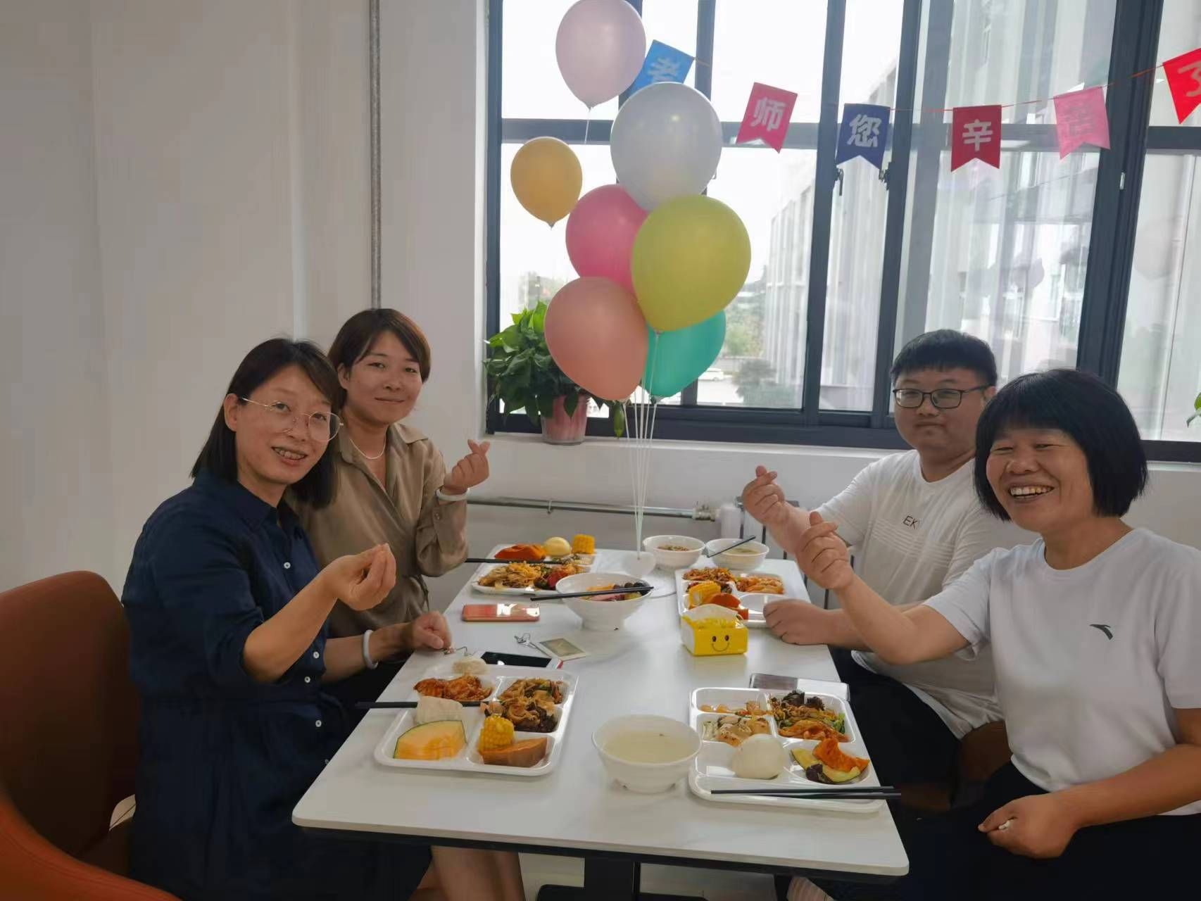 9月10日中午,装饰一新的校区餐厅里,悬挂着“躬耕教坛,强国有我”的横幅;明亮的玻璃窗上,布置着“老师,您辛苦了”的彩旗;绿植掩映的窗台及洁白的餐桌上,放置着一簇簇彩色气球。自助餐台上,各色菜肴、小吃、果切恭候着老师们的光临。