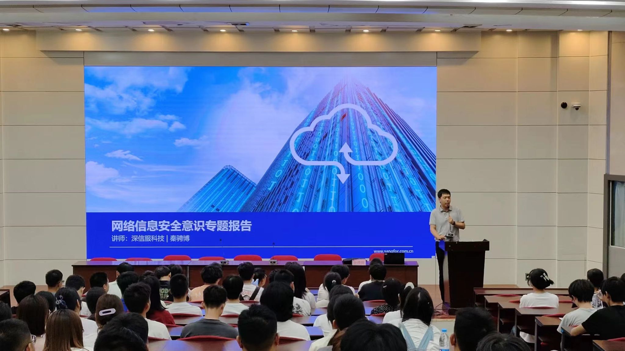 专业教育活动后,深信服陕西区教育事业部解决方案主管秦骋博在阶梯教室为现代通信、大数据和计算机三个专业的新生进行网络安全教育。此次讲座旨在提升学生网络安全意识,普及相关网络安全知识,抵制不良诱惑,谨防上当受骗。会上,秦骋博通过分发知识手册、播放宣传短片以及有奖竞猜等趣味环节与同学们互动,向同学们警示网络中存在的风险与危害。