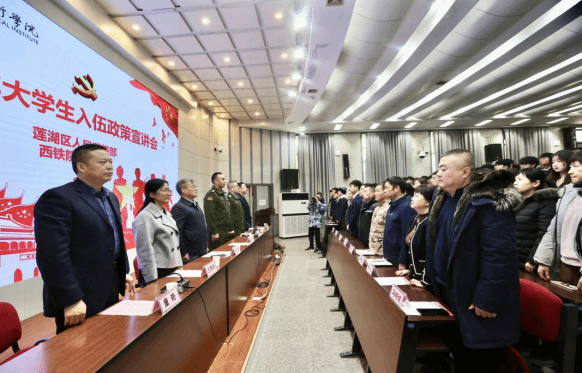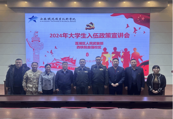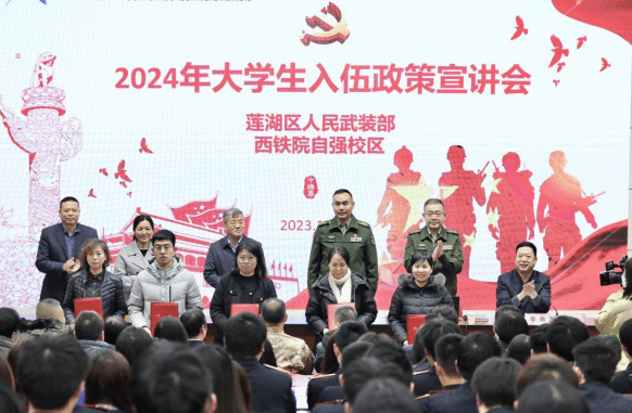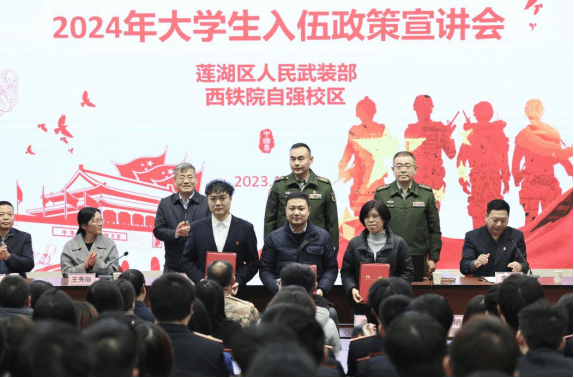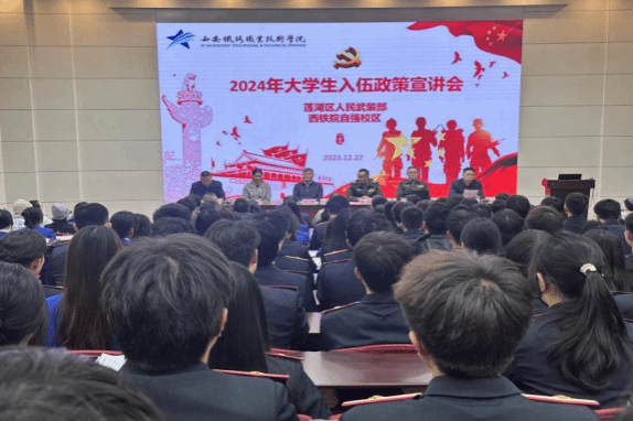 12月27日下午,纽约国际最新官方网站自强校区教学楼东阶梯教室报告厅内座无虚席、青春激扬,莲湖区人民武装部在此成功举办了2024年大学生入伍政策宣讲会。莲湖区区委委员、莲湖区人民武装部上校政委王洋、莲湖区人民武装部上校部长彭明友、学院武装部部长、安全保卫处处长毛卫军、交通运输学院党总支书记王秀丽、电子信息学院党总支副书记、院长董奇、自强综合管理处副处长李勇、交通运输学院、电子信息学院学工办主任、辅导员、班主任及260余名学生代表等参加了宣讲会。校区3000余名学生在智慧教室同步观看了直播。宣讲现场气氛热烈、掌声雷动、宣讲会既深入宣传征兵政策,又对青年学子进行了生动的国防及爱国主义教育,收效明显。