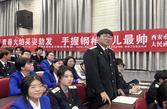 莲湖区武装部上校政委王洋为同学们宣讲青年学生应征入伍相关政策。主要从应征入伍基本条件、入伍流程、青年学生参军特别优惠政策和军营生活等方面进行了详细的政策解读。他鼓励广大有理想、有抱负的青年学生把个人理想抱负融入强军梦、中国梦,切实将国防信念牢固于心,踊跃参军入伍,无尚光荣,铁血军营,等你加入。